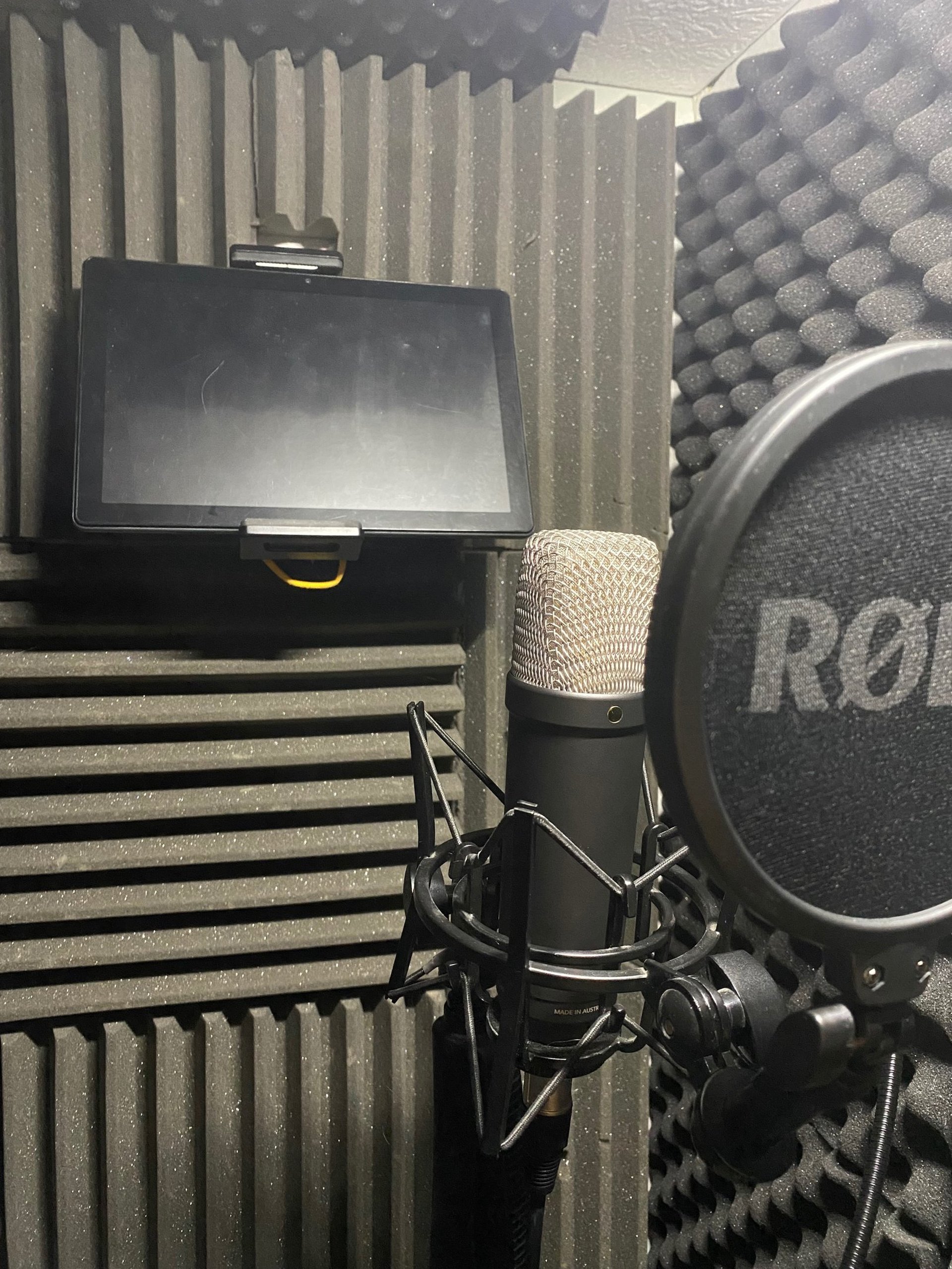 Studio : 2 micros Rode NT1 5th génération, interface Scarlett Focusrite, casque AKG, cabine Speak, environnement Mac, logiciels Audition et Reaper.